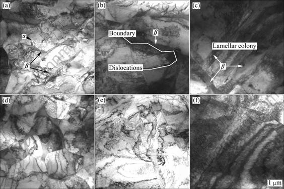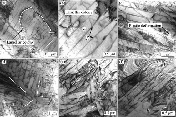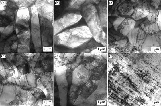 Fig.6 Morphologies of plastic deformation(a), dislocation in β phase(b), dislocation in phase boundary(c), and high density dislocation ((d)-(f)) at crack tip in base metal