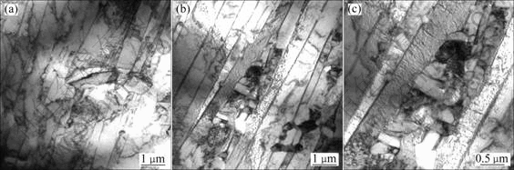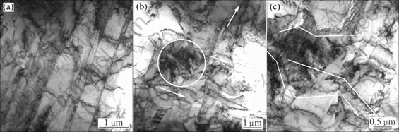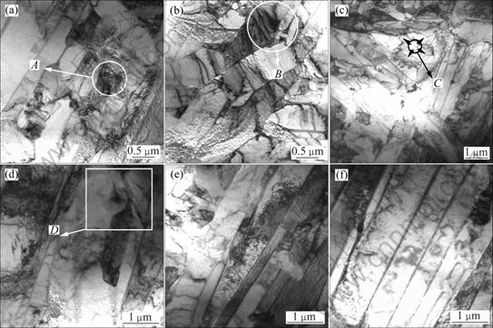 容易发展成为裂纹源。由图9可知,焊缝区有些区域并不是规则的马氏体板条,还存在一些等轴状的α相。图9(a)所示为马氏体边缘等轴状与柱状的α相形态。在其边界上,有位错呈弧形分布形态,边界某处的位错密度比相内的位错密度高,并在一定区域聚集成团(见图9(a)中A区)。图9(b)所示为等轴α相形态,在相内位错线呈规律分布,在相间存在细碎相(见图9(b)中B区),细碎相之间位错大量聚集。图9(c)所示为几个方向马氏体束的结合处,结合处中心有圆形位错发散的形态(见图9(c)中C区),表明马氏体束交界处位错容易萌生。图9(d)所示为两细片马氏体之间的α相形态,在一些区域(见图9(d)中D区),受循环应力作用,一些层片较细的束发生严重的塑性变形。这表明,在裂纹的尖端,越细小的组织越可能成为疲劳过程中的“弱化区”,这些“弱化区”在循环应力作用下,细碎相发生塑性变形,导致驻留滑移带的软化,从而加速裂纹扩展。在较细的马氏体束内的位错密度高于较厚的马氏体束的位错密度(见图9(e)和(f))。SHADEMAN等[17]发现,Ti-6Al-4V板条的组织粗大,抗裂纹扩展能力上升。通过对塑性区大小的计算,JINKEUN等[14]认为,在应力强度因子范围?K较小时,影响裂纹扩展速率最重要的因素是α板条的宽度,板条宽度越小,裂纹扩展速率越大。ZUO等[16]的研究表明:较细的α板条充当的作用就像一条晶界,在此处裂纹更容易萌生。在循环应力的作用下,位错在合金的“软点”萌生,并呈发射状运动(见图10)。对裂纹边缘与裂纹尖端的TEM像进行对比研究发现,细小的板条更容易发展成为位错萌生的源点,裂纹尖端的位错密度要远大于裂纹边缘的位错密度,且裂纹尖端应力集中,塑性变形程度也更高。焊缝区由于焊接过程中的热应力作用,一些马氏体被碎化成为细碎相,细碎相边界成为疲劳裂纹源。