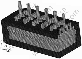 图2所示为所建立算例模型的网格划分图。模型包括:阳极导杆和钢爪、阳极、电解质熔体、铝液、阴极和钢棒等导电部分,用具有电热2个自由度的SOLID69单元进行网格划分;氧化铝覆盖料、电解质结壳、侧部炭块、槽帮伸腿、底部保温材料以及槽壳等不导电部分用仅有一个温度自由度的SOLID70单元进行网格划分。在电接触和热接触的定义中,采用接触对单元CONTA173和TARGE170。
