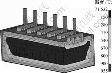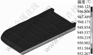 为接触面的接触热导率,相当于式(8)中的hE,取相同的值并具有相同的单位。Tt和Tc分别为目标面和接触面的温度。定义接触时,定义熔体面为目标面,槽帮伸腿表面为接触面,分别采用目标单元TARGE170和接触单元CONTA173,选择接触自由度为热接触。
