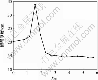 但变化幅度比较小;(3) 在靠近角部处槽帮厚度有大幅度增加,这说明小面和角部处的保温效果不好。在实际生产过程中,端部阳极与中间阳极相比,产热量相同,但散热面积却大了很多,特别是角部拐角处,有较大的散热面积。因此,小面和角部的散热量大,因此,现行传统槽的设计原则是小面和角部保温而大面散热,说明计算结果是比较符合实际情况的。
