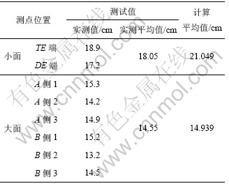 同时,为了验证计算模型的准确性,将槽膛内形参数计算值与某铝厂同规格预焙铝电解槽系列204号电解槽测试值进行了对比,结果如表2所示。由于角部槽帮厚度与大小面差异大,在求计算平均值时忽略角部,小面取端部4个点求平均值,大面取端部10个点求平均值。可以看出:在实际测试情况中,大面部分进电面和出电面均是中部槽帮最薄,往角部处逐渐变厚,而端部槽帮最厚,这一槽帮厚度变化趋势与计算值是吻合的。此外,测试值与计算结果的平均值误差在3 cm以内,考虑到模型简化带来的误差以及实际生产过程中操作工艺的影响,计算值和测试值在精度上基本吻合。从而验证了算法的有效性。