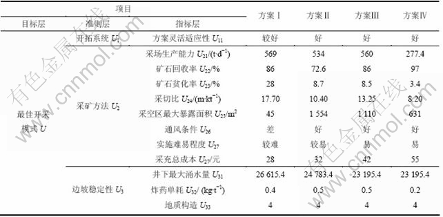 B=UR=(0.458 2  0.843 2  0.898 8  0.807 5),即各方案的综合优越度为:方案Ⅲ,89.88%;方案Ⅱ,84.32%;方案Ⅳ,80.75%;方案Ⅰ,45.82%。则方案中,崩落法开采模式远劣于空场法及充填法开采模式,其优劣次序为方案Ⅲ,方案Ⅱ,方案Ⅳ,方案Ⅰ,即方案Ⅲ(分段凿岩阶段出矿嗣后充填法开采模式),为最佳开采模式。