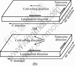 Fig.1 Definition of longitudinal and transverse directions of samples: (a) Unidirectional rolling; (b) Tandem rolling
