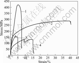 Fig.2 Stress—strain curves of unidirectionally cold rolled ADSC alloys under different conditions: 1 Cold rolling (0?); 2 Annealing (0?); 3 Cold rolling (90?); 4 Annealing (90?)