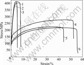 Fig.3 Stress—strain curves of tandem cold rolled ADSC alloys under different conditions: 1 Cold rolling (45?); 2 Cold rolling (90?); 3 Cold rolling (0?); 4 Annealing (0?); 5 Annealing (45?); 6 Annealing (90?)