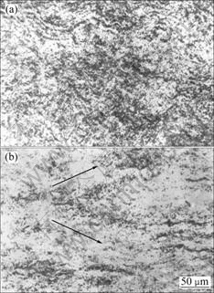 Fig.4 shows metallographical microstructures of unidirectionally rolled ADSC alloys. Highly elongated fibre structure that is parallel to the rolling direction is observed in the cold rolled specimen, and the length-to-width ratio of fibres is much higher (Fig.4(a)). Because the alumina content for this ADSC alloy is lower (about 0.23%, volume fraction), its ability to inhibit the recovery and recrystallization of the Cu-0.23%Al2O3 (volume fraction) alloy is not strong, therefore, a large number of recrystallization grains with different sizes are generated after annealing, yet, the configuration of the elongated fibre structure still exists (Fig.4(b)). The metallographical microstructures of tandem rolled ADSC alloys under different conditions can be observed in Fig.5. It can be seen that, fibre structure does not exist in the matrix of cold rolled ADSC alloy, and its deformation microstructure is much more homogeneous. However, the configuration of cross fibre structure appears after annealing at 900 ℃ (as arrow directions shown in Fig.5(b)), and recrystallization grains can not be observed by metallographic microscope, which may be resulted from the fact that tandem rolling makes dispersion particles distribute more uniformly, and its ability to inhibit recovery and recrystallization is improved.