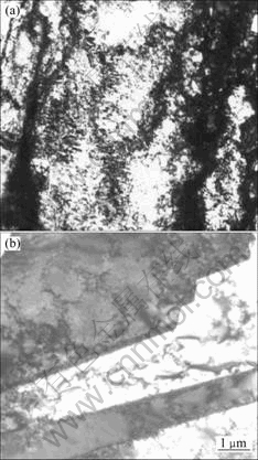 Fig.6 TEM micrographs of unidirectionally rolled ADSC alloys under different conditions: (a) Cold rolling by 80%; (b) Annealing at 900 ℃