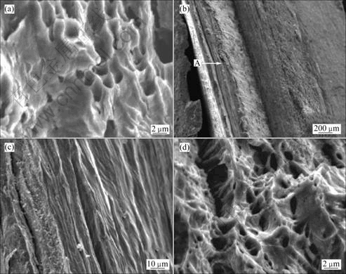 Fig.8 Tensile fracture micrographs of cold rolled ADSC alloy under different conditions: (a) Unidirectionally cold rolling (0? direction); (b) Unidirectionally cold rolling (90? direction); (c) Magnification of position A in Fig.8(b); (d) Tandem cold rolling (0? direction)