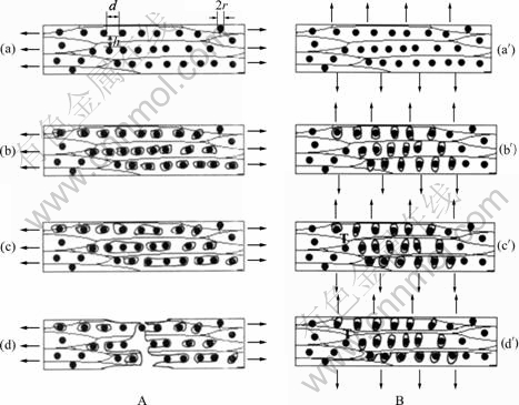 In order to analyze tensile fracture behaviors of Cu-0.23%Al2O3 (volume fraction) alloy under different conditions, two models for the longitudinal and transverse tensile fracture process are shown in Fig.9. In Fig.9, the black round spots represent alumina particles, the elongated band structure represents fibre structure formed in the cold rolling process, r is particle radius, d and h are the interparticle spacing in longitudinal and transverse directions respectively. As mentioned above, the longitudinal tensile loads are parallel to the aligned direction of fibre boundary, so it is not easy to form cracks on the fibre boundary. But due to large differences of properties between alumina particles and copper matrix, cracks will be firstly formed at the matrix/particle interface as alumina particles decohere from the matrix (Fig.9A(b)). Then the cracks grow and coalesce into voids in the loading direction (Fig.9A(c)). Finally, voids coalesce in rows and complete fracture occurs (Fig.9A(d)). It can be seen that the process of longitudinal tensile fracture of ADSC alloys has much in common with that of ordinary metal-based composites containing dispersion strengthened phases[12-14]. This model can also be used to explain the fracture processes of the tandem rolled ADSC alloys in three directions. Because tandem rolled ADSC alloys do not have fibre structure, and the effect of fibre boundary on tensile fracture behaviors can be ignored, the elongated band structure in the models should be removed.