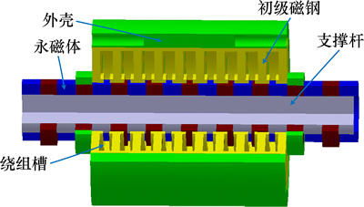 基于永磁同步电机原理,本文设计一款新型圆筒型永磁同步电磁直线作动器如图2所示,作动器主要由初级磁钢、三相绕组、支撑杆(次级)、永磁体和外壳5部分构成。