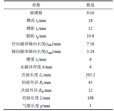 式中:lz为作动器安装长度;ls为作动器行程;τs为槽距,则作动器槽数为9个。作动器初级与次级为低速相对运动,选用多极结构,作动器极对数3~5,为了使结构紧凑,采用分数槽结构。针对9槽8极或10极结构,取较大绕组分布系数0.945[11]。