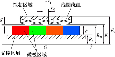 针对本文设计的基于Halbach排列的圆筒形直线作动器,将作动器划分为铁芯区域、磁极区域和支撑区域进行解析分析,如图4所示。图4中:g为气隙;Rs为初级外径;Ri为初级内径;Rm为磁体外径;Rr为磁体内径;b0为槽口宽。