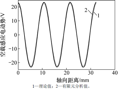 对作动器有限元(FEA)模型及数学模型进行验证,基于静态磁场分析对径向气隙磁场进行分析,径向磁通密度曲线如图6所示,基于瞬态分析作动器空载感应电动势曲线如图7所示。对作动器在6 A交流电流下电磁力进行分析,结果如表3所示。