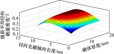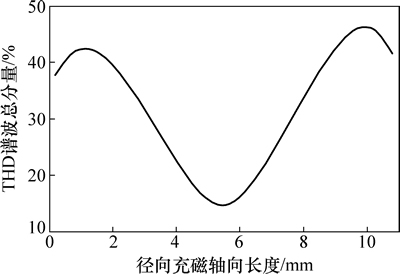 由图8可知:径向磁通密度随磁体厚度的增加而增加,随磁体轴向长度先增加后降低,在厚度为8 mm以前Bave增幅比较明显,因此永磁体厚度在8 mm左右,永磁体作用发挥较大。当厚度一定时,径向充磁轴向长度τmr为极距1/2附近具有峰值。由图9可知:当τmr为4~7 mm时,具有较低谐波总分量。