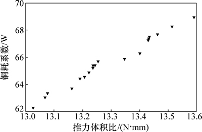 由图11可知:作动器铜耗系数随推力体积比的增加而增加,即随着推力体积比增加作动器发热更多,因此,对Pareto解集中解的选取显得尤为重要。