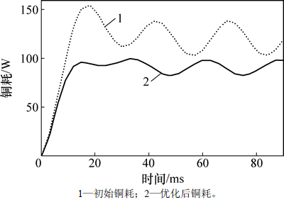 根据表5所得作动器优化前后结构参数,利用Ansoft Maxwell软件对应建立其有限元瞬态分析模型,对优化前后作动器电磁力及绕组铜耗进行对比分析,图13所示为6 A交流电流下作动器优化前后电磁力曲线,图14所示为考虑电感在6 A交流电流下优化前后作动器铜耗曲线,优化前后作动器具体性能参数比较如表6所示。
