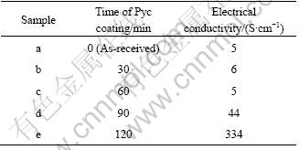 The as-received Al2O3 fibers are typical insulator, whereas the PyC has a significantly higher conductivity because of the existing of π-bonding in PyC. Table 2 shows that the electrical conductivity of fiber with PyC coating increases with the increase of coating time. The value increased from 5 to 334 S/cm. The electrical conductivity of Al2O3 fiber increased sharply when the time of PyC coating was 90 min. We suggest that the conductance mechanism of Al2O3 fiber with PyC coatings is migrating conductance in the graphite plane and hopping conductance among graphite planes based on the discussion on conductance of carbon fibers supposed by CAO et al [19, 20]. In other words, there are free electrons in the graphite plane and weak bond electrons among graphite planes in PyC coatings.