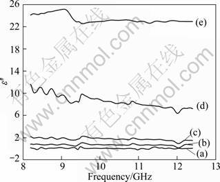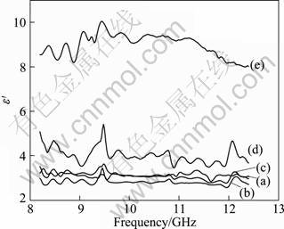 Fig. 4 ε′ as function of frequency in range of 8.2-12.4 GHz for Al2O3 fiber fabrics with various PyC deposition time: (a) As- received; (b) 30 min; (c) 60 min; (d) 90 min; (e) 120 min