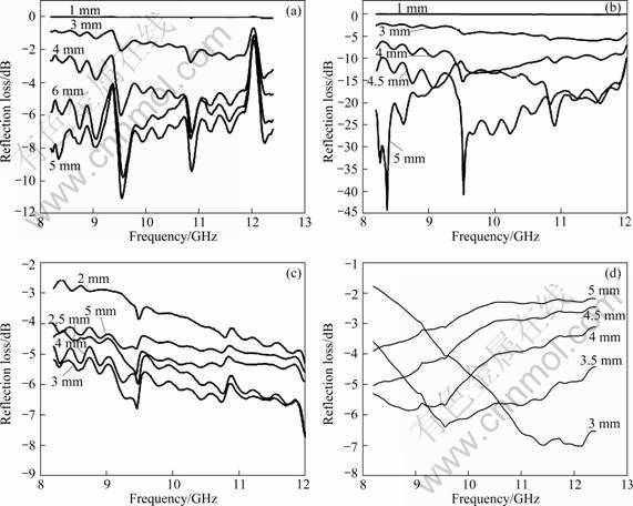Fig. 6 Microwave absorbing properties of Al2O3 fiber fabrics with different sample thicknesses: (a) 30 min; (b) 60 min; (c) 90 min; (d) 120 min