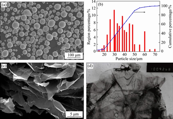 Figure 1 Surface morphology (a) and particle size distribution (b) of CP-Ti powders; surface morphology (c) and BF-TEM image (d) of graphene particles