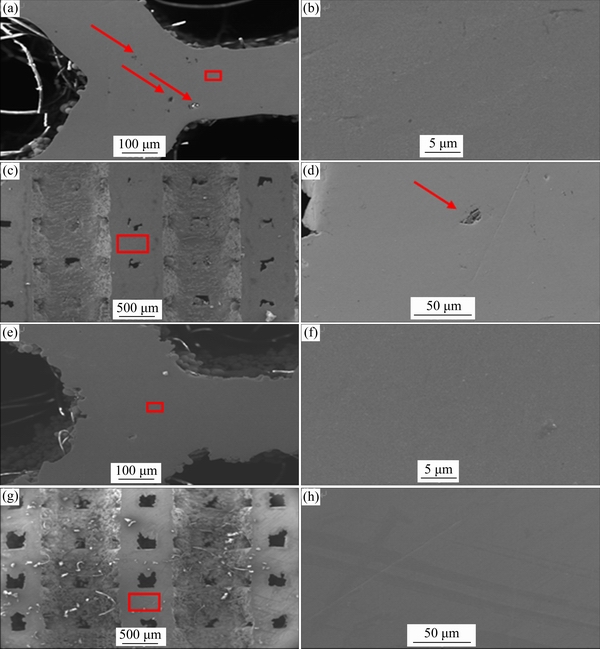 Figure 3 Cross-sectional SEM images of the as-polished SLM Ti and GNPs/Ti: (a) SLM Ti perpendicular to deposition direction; (c) SLM Ti parallel to deposition direction; (e) SLM GNPs/Ti perpendicular to deposition direction; (g) SLM GNPs/Ti parallel to deposition direction ((b), (d), (f) and (h) are the closer view of selected region in (a), (c), (e) and (g))