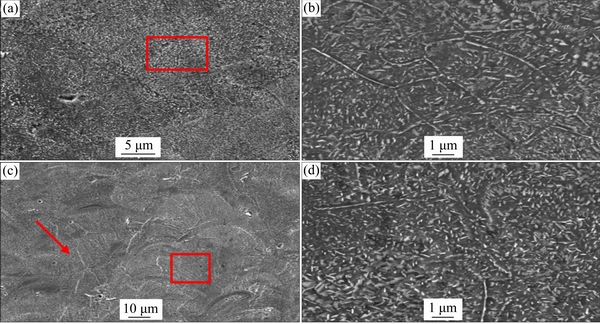 Figure 6 SEM images of etched SLM GNPs/Ti: (a) Perpendicular to deposition direction; (c) Parallel to deposition direction ((b) and (d) are closer view of selected region in (a) and (c))