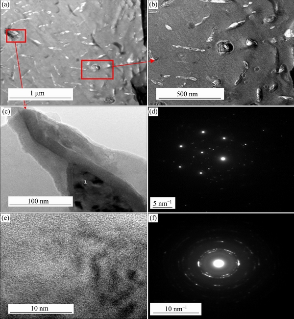 To further characterize these white particles, TEM analysis on the SLM GNPs/Ti was conducted. The analysis results are displayed in Figure 7. White particles in the form of columnar grains are clearly visible in Figure 7(a), and the corresponding SAD pattern reveals that the in situ synthesized particles (Figure 7(b)) are TiC phase (Figure 7(d)). This observation is consistent with XRD results (Figure 4). Moreover, TiC particle exhibited spherical and strip morphology in the SLM GNPs/Ti composite, and the size of TiC particles was less than 500 nm. Then the TEM result further confirmed the formation of flake area microstructure (Figure 7(c)). Figure 7(f) is the selected area diffraction pattern of Figure 7(c). There were some retained GNPs (Figure 7(e)) at flake area of SLM GNPs/Ti. Simultaneously, Figure 7(e) shows the high resolution TEM image of Figure 7(c). The presence of TiC particles proved that SLM destroyed the structure of graphene, causing part of the graphene to react with titanium. The TiC particles individually distributed together with the residual GNPs along the interface in the SLM GNPs/Ti. The TiC grains and GNPs were combined well with Ti matrix, providing tight interfacial bonding [33, 34]. By comparing the microstructure of the SLM Ti and GNPs/Ti, the results revealed that the incorporation of GNPs made TiC particles appear in the fine needle or lath shaped martensitic Ti.