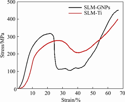Figure 8 Compression stress-strain curves of SLM Ti and GNPs/Ti