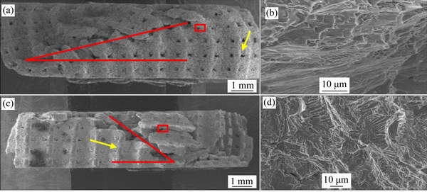 Figure 9 Compression fracture morphologies of SLM Ti ((a) and (b)) and GNPs/Ti ((c) and (d)) ((b) and (d) are closer views of selected regions in (a) and (c), respectively)