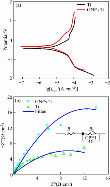 Figure 10 Polarization curves (a) and Nyquist plots (b) of SLM Ti and GNPs/Ti (The inset in (b) is the EIS fitting equivalent electrical circuits)