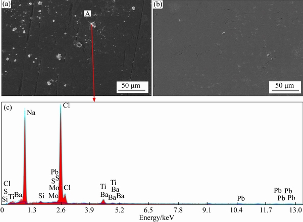 Figure 11 presents the surface characteristics of the corroded SLM Ti and GNPs/Ti in Ringer’s solution. GNPs/Ti and Ti specimens did not present obvious corrosion products such as corrosion spots and corrosion pits, indicating that the corrosion resistance of GNPs/Ti and Ti specimens is excellent. As presented in Figure 11(a), more white crystalline matter appears on the surface of Ti specimens than GNPs/Ti specimens. The EDS (energy dispersive spectrometer) analysis of spot A in Figure 11(a) shows that the white material is NaCl crystals, which indicates that the GNPs/Ti have a smaller corrosion current density during the electrochemical corrosion process.