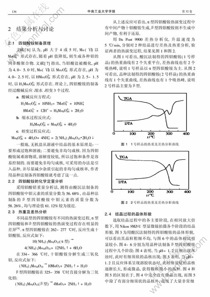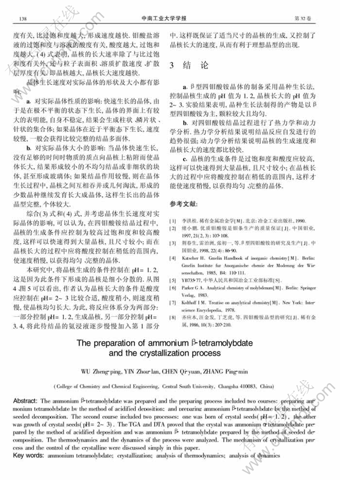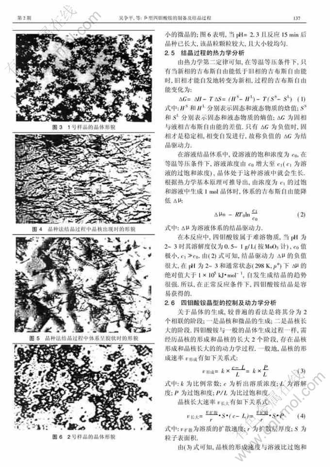 关键词:四钼酸铵;结晶;热力学分析;动力学分析