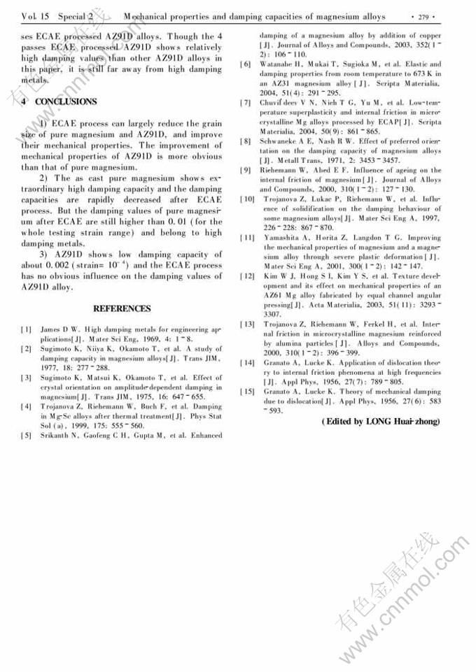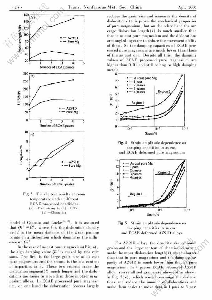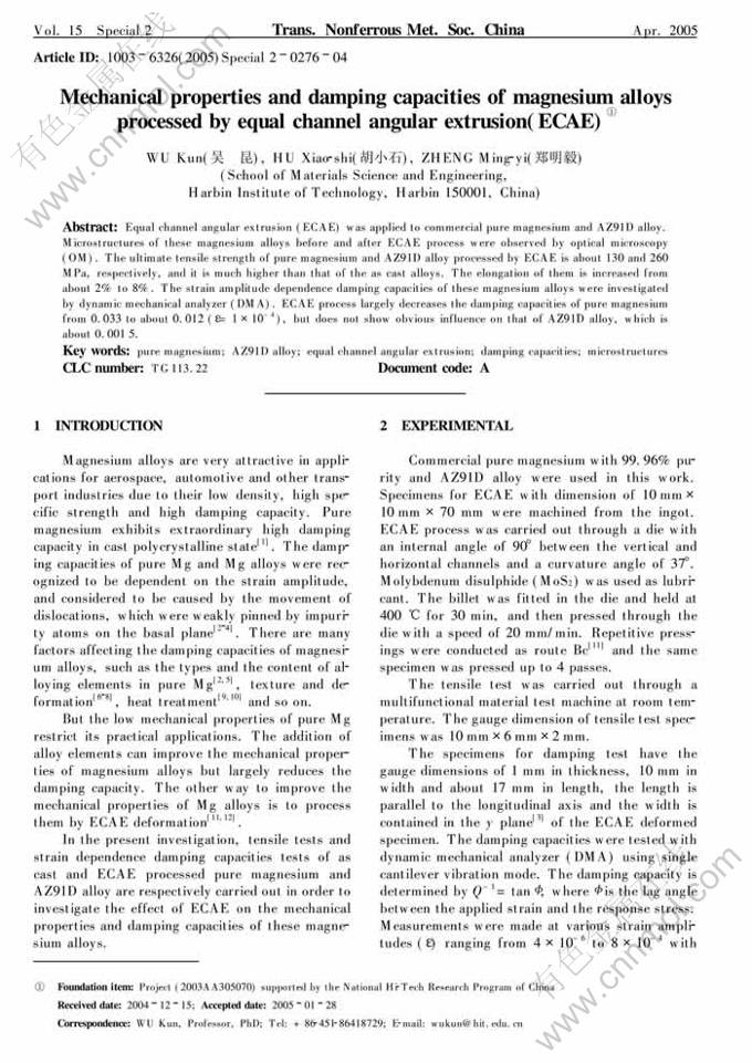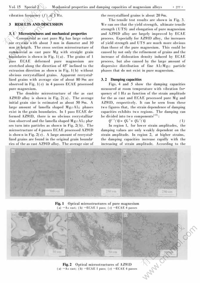 Key words:pure magnesium; AZ91D alloy; equal channel angular extrusion; damping capacities; microstructures
