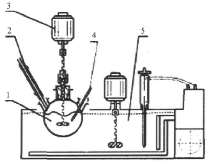 1-Three-necked flask;2-Condenser pipe;3-Agitator;4-Precise thermometer;5-Thermostatic water bath