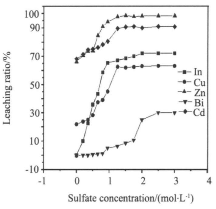 由图2可以看出, 当硫酸初始浓度为0时 (用水浸出) , 铟、 铋的浸出率为零, 铜的浸出率为20%, 而锌、 镉的浸出率达到67%。 这说明锌、 镉以易溶于水的氧化物和硫酸盐形式存在, 铜、 铟、 铋则主要以难溶的氧化物形态存在, 单纯用水作浸取剂不能满足要求。