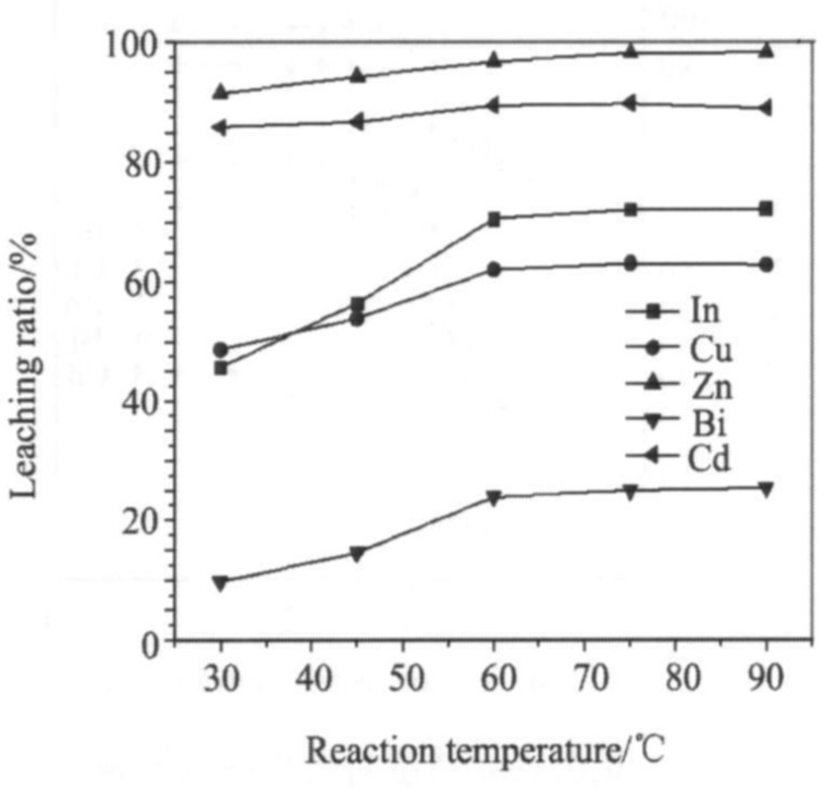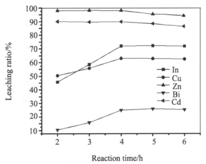 由图5可以看出, 反应时间从2增至4 h, 锌、 镉的浸出率没有明显变化, 而铜、 铟、 铋的浸出率则逐渐增大。 这是因为烟尘中的锌、 镉主要以易溶的氧化物和硫酸盐形式存在, 而烟尘中铜、 铟、 铋的化合物与硫酸的反应速度相对较低。 但是, 随着反应时间的进一步延长, 铜、 铟、 铋的浸出率没有明显提高, 而锌、 镉的浸出反而有所下降。 这可能是因为反应时间过长, 溶解的锌、 镉化合物又部分被体系中的固体物质所吸附。 故反应时间控制在4 h为宜。