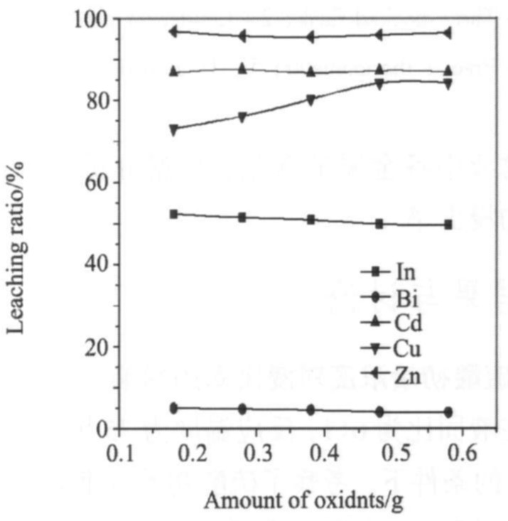 由图6可以看出, 氧化剂高锰酸钾的添加使铜的浸出率由63%提高到84%, 对锌和镉的浸出率几乎没有影响, 但使铟的浸出率有所降低。 为了保证铟的浸出率, 不宜添加氧化剂, 损失在浸渣中的铜可以通过火法从铅冰铜中回收。