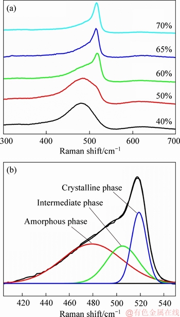 Figure 3 Raman spectra of Si:H thin films deposited under different hydrogen flow ratios (a), Gaussian fitting of μc-Si:H films prepared with 60% hydrogen flow ratio (b)