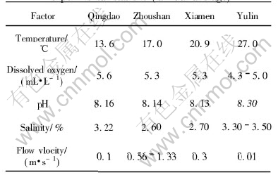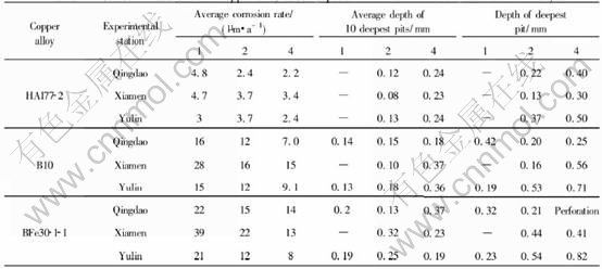 1) In the immersion zone, copper and copper alloys suffer from pitting corrosion due to high temperature and marine creature adhesion at Yulin, because of higher velocity of seawater containing sand at Zhoushan. And the seawater of
