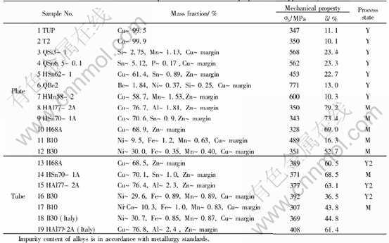 In this experiment, 12 kinds of plates and 7 kinds of tubes of copper and copper alloy were studied. Chemical composition and mechanical property of samples are shown in Table 2. The plates were cut to 200mm×100mm.The longer