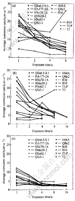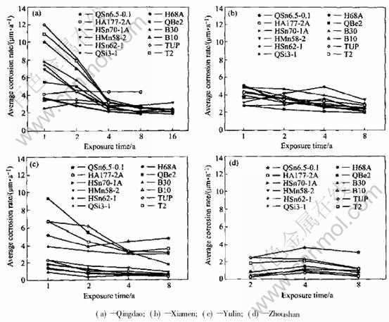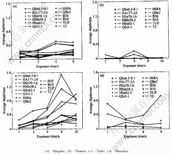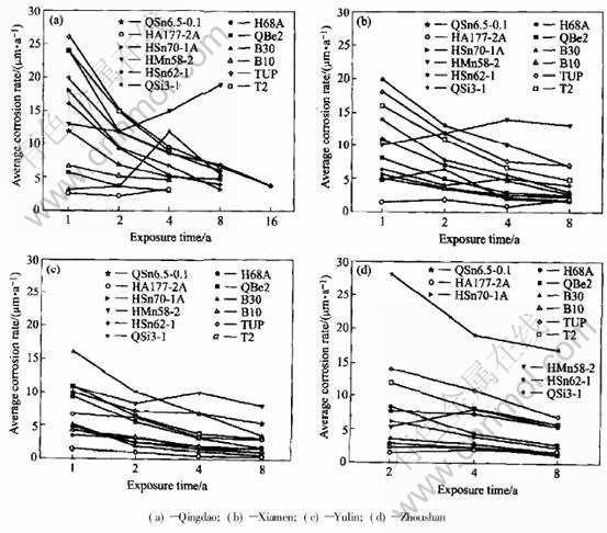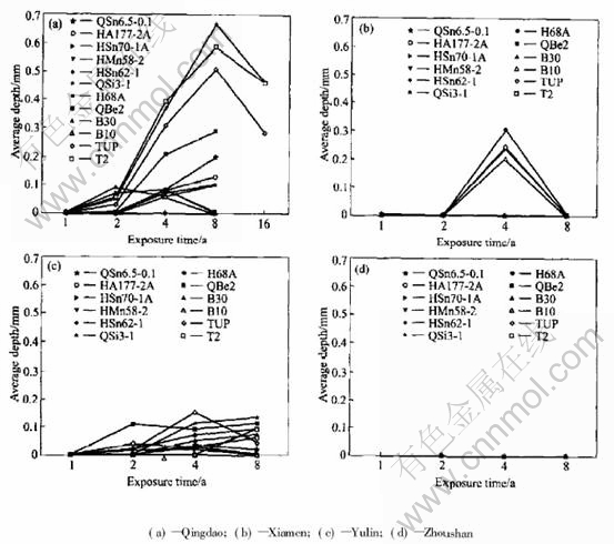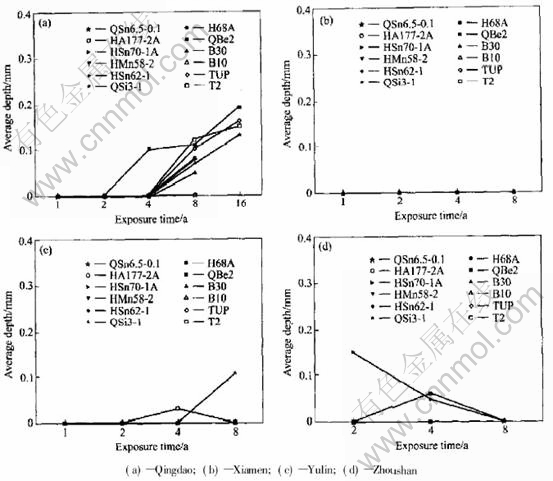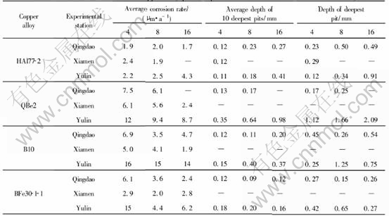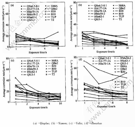 2) In the tide zone, the average corrosion rate of copper alloys decreases in sequence of Qingdao, Xiamen, Zhoushan, Yulin. And copper and copper alloy have pit corrosion only at Qingdao and Yulin.
