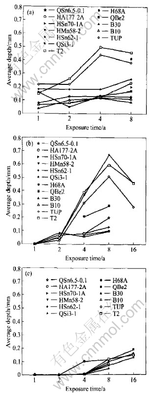 Fig.6 Average depth of 10 deepest pits on copper alloy plates exposed in splashing zone of seawater