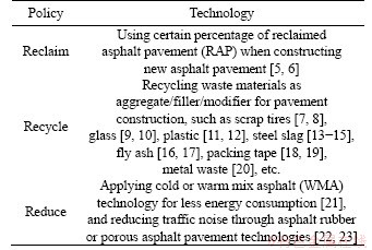 Asphalt concrete (AC), the most frequently used paving material for highway construction, is conventionally prepared by blending aggregates, asphalt binder, and fillers together in elevated temperature with tremendous heat energy [1, 2]. While offering indispensable contribution to society, asphalt pavement significantly influences environment in all periods including construction, operation, and maintenance [3]. Since nowadays sustainability has attracted a lot of interest worldwide, the construction of infrastructures, including asphalt pavement, are suggested to follow reclaim, recycle and reduce (3R) principles [4]. Generally, reclamation in pavement engineering refers to the process of reclaiming road materials from loss or from a less useful condition; recycling involves processing waste materials from other fields into useful pavement products; and reduce means consuming less energy and bringing less pollutants to environment during the life cycle period. In recent years, many sustainable asphalt paving technologies fitting “3R” were developed and applied (Table 1). Besides, novel asphalt pavements with additional functions may also be beneficial to energy harvesting and environmental protecting, such as hydronic asphalt pavement [24, 25], photocatalytic pavement [26, 27], quiet pavement [28, 29], cool pavement [30] and self- healing asphalt pavement [31, 32].