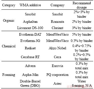 Nowadays, there are over 40 commercially available WMA products. Table 3 lists some typical WMA products that have been widely applied in field projects. The selection of WMA products is decided by many influencing factors like the quantity of WMA mixture and the designed producing temperature of WMA mixture. Some WMA processes may need higher material cost or special blending equipment. A holistic literature review about WMA products has been conducted by RUBIO et al [1], where the performance, benefits, drawbacks of different WMA technologies were thoroughly introduced [1]. Regarding the negative effects, WMA mixtures were reported to be more susceptible to moisture damage (stripping) because aggregates may not be completely dried at lower WMA temperatures [73]. In addition, the insufficient hardening effect caused by the lower WMA temperatures may compromise with the high temperature performance of some WMA mixtures [74].