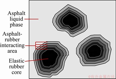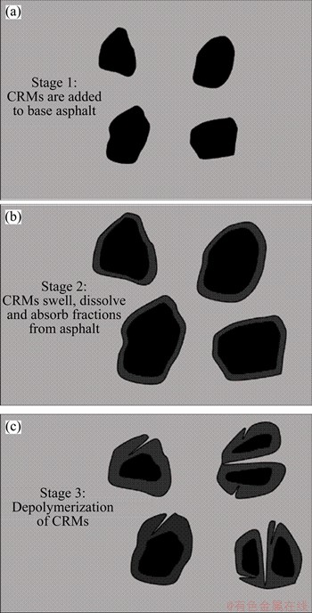 Crumb rubber, shredding from passenger car tires or truck tires, mainly comprises nature rubber, synthetic rubber, carbon black and fillers [111]. According to the different polarities, asphalt can be separated into four fractions, which can be distinguished by their polarity. Highly polar asphaltene micelles are dispersed in a viscous phase of saturates, aromatics and resins (maltene phase) [112]. The interaction mechanism within AR has been extensively investigated by many previous studies [113-117]. Especially, WANG et al [118] have comprehensively summarized the available chemical methods used for characterizing the interaction among components in AR binder. The interaction between crumb rubber and asphalt happens during the high shear blending in evaluated temperature. During the interaction, the crumb rubber changes by two stages: swelling and dissolution. And the swelling and dissolution of crumb rubber happens simultaneously [118].