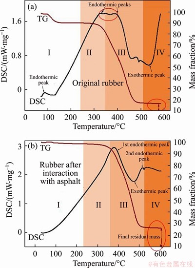 The dissolution of CRM has been demonstrated by YU et al [119] through thermal analysis. As shown in Figure 2, the dissolution of CRM can be indicated by the higher amount of final residual mass and the disappearance of natural rubber’s endothermic peak. Compared to the original CRM, the extracted CRM shows a similar pattern in the thermogravimetric (TG) curve but a different shape in the differential scanning calorimetry (DSC) curve. The main weight loss of the extracted CRM still occurs from 300 °C to 500 °C. However, the final residual mass fraction of the extracted CRM (about 26 wt%) is higher than that of the original CRM (17 wt%), indicating that the interaction of rubber with base asphalt may have consumed part of the decomposable polymers. Besides, the DSC curve of the original CRM has two clear endothermic peaks from 300 °C to 500 °C, while the extracted CRM only has one, indicating that the components in the original CRM are more complicated. The peak within the range of 300- 400 °C is due to the nature rubber component of CRM while the one within the range of 400- 500 °C is related to the synthetic rubber. The disappearance of nature rubber’s endothermic peak is caused by its partial dissolution during interaction with asphalt fractions.