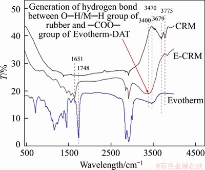 Figure 4 FTIR spectra of CRM, Evotherm-DAT and E-CRM (CRM after soaking into Evotherm-DAT)