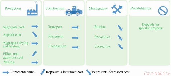 In terms of the effect of WMA, some studies proved that significant benefit on energy saving can be achieved by incorporating WMA [149, 150]. Economic merits can be also obtained by the enhanced in-place density and smoothness. However, some publications proposed that the energy saving effect depends on the types of WMA technologies. Moreover, the benefits obtained from lower construction temperature may be offset by the greater impacts of the additional material cost [151]. WANG et al [152] believed that WAR requires higher initial cost compared to conventional HMA, but it is more cost-effective in life-cycle due to the enhanced engineering performance and lower maintenance cost. CAO et al [153] analyzed the long-term energy-reducing effect of different WMA additives in AR pavements by LCA framework incorporated with uncertainty analysis. They found that a noticeable energy saving can be obtained by the incorporation of WMA technologies during the construction period. Using FT-wax was proved to be the most economic choice considering the life-cycle energy consumption. Figure 5 shows the expected cost analysis of WAR pavement compared to HMA. It is noted that WAR should have long-term economic benefits. Nevertheless, compared to the abundant studies focused on engineering performance of WAR, research on economic effect of WAR is relatively limited.