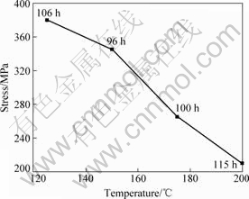 1) 在125~200 ℃蠕变过程中,当蠕变寿命都接近100 h时,蠕变应力随着蠕变温度的升高明显下降。与125 ℃时相比,150 ℃时合金的蠕变应力下降9.3%;175 ℃时合金的蠕变应力下降30.3%;当蠕变温度为200 ℃时,蠕变应力下降幅度达到45.8%。